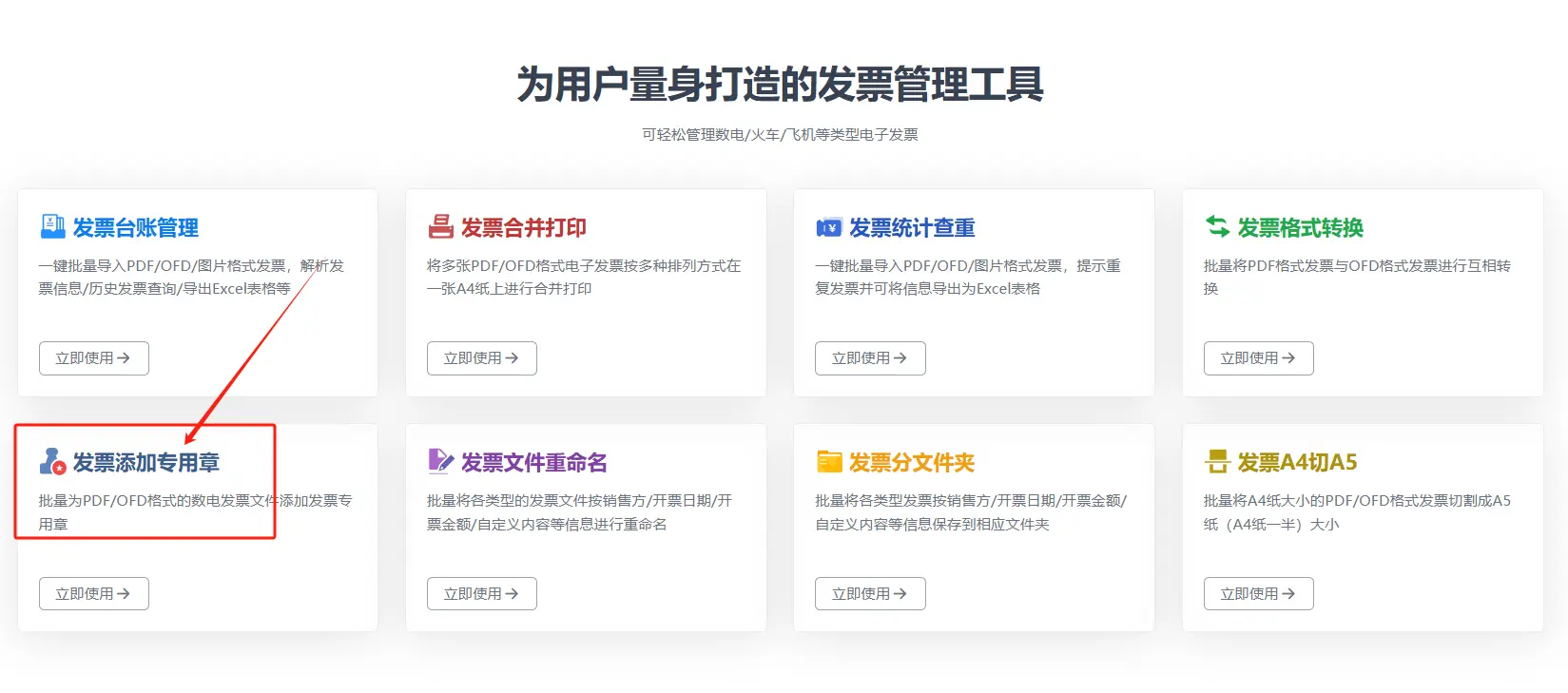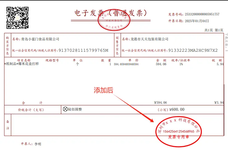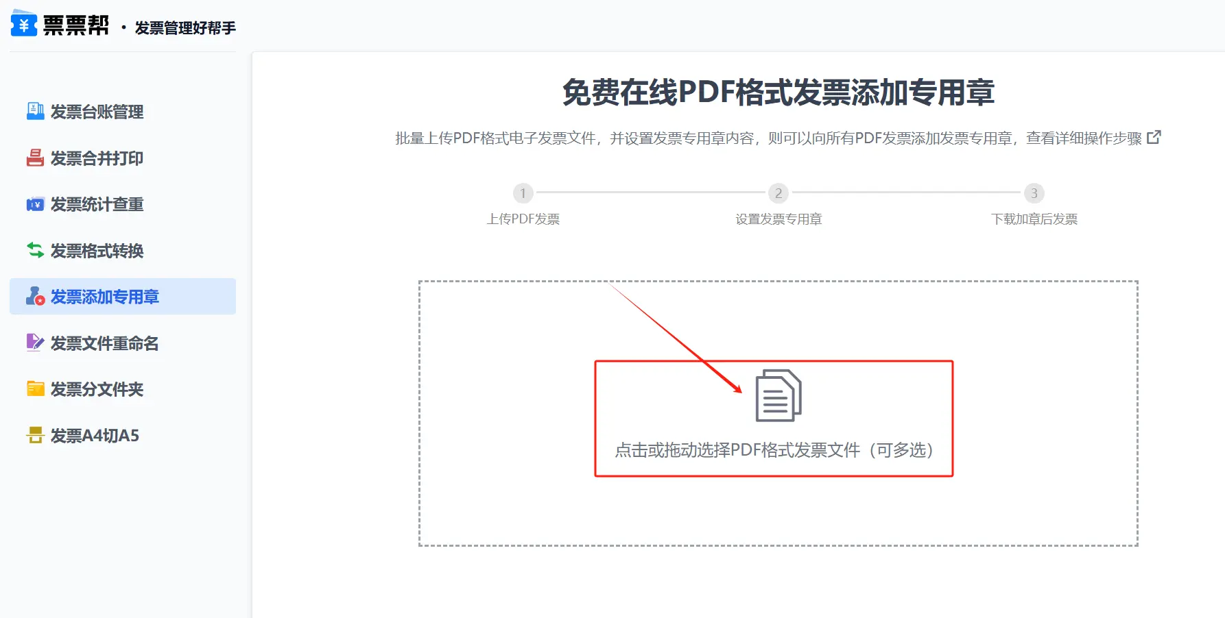 本功能可实现在一张或多张PDF发票右下角添加发票专用章。