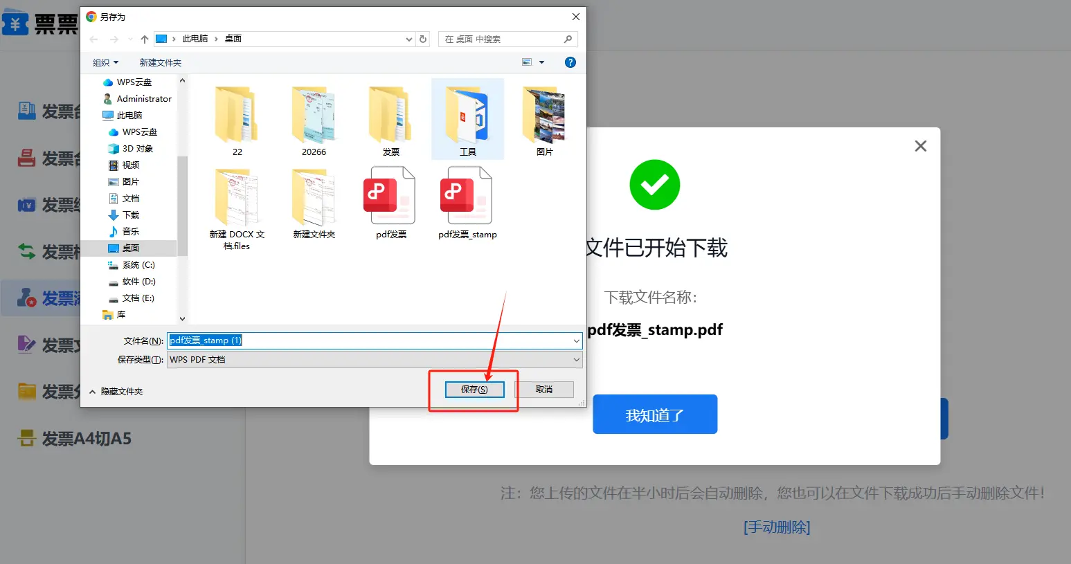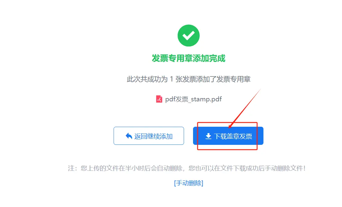 发票章添加完成后,点击“下载盖章发票”按钮,选择文件保存位置并点击“保存”按钮即可完成文件下载。