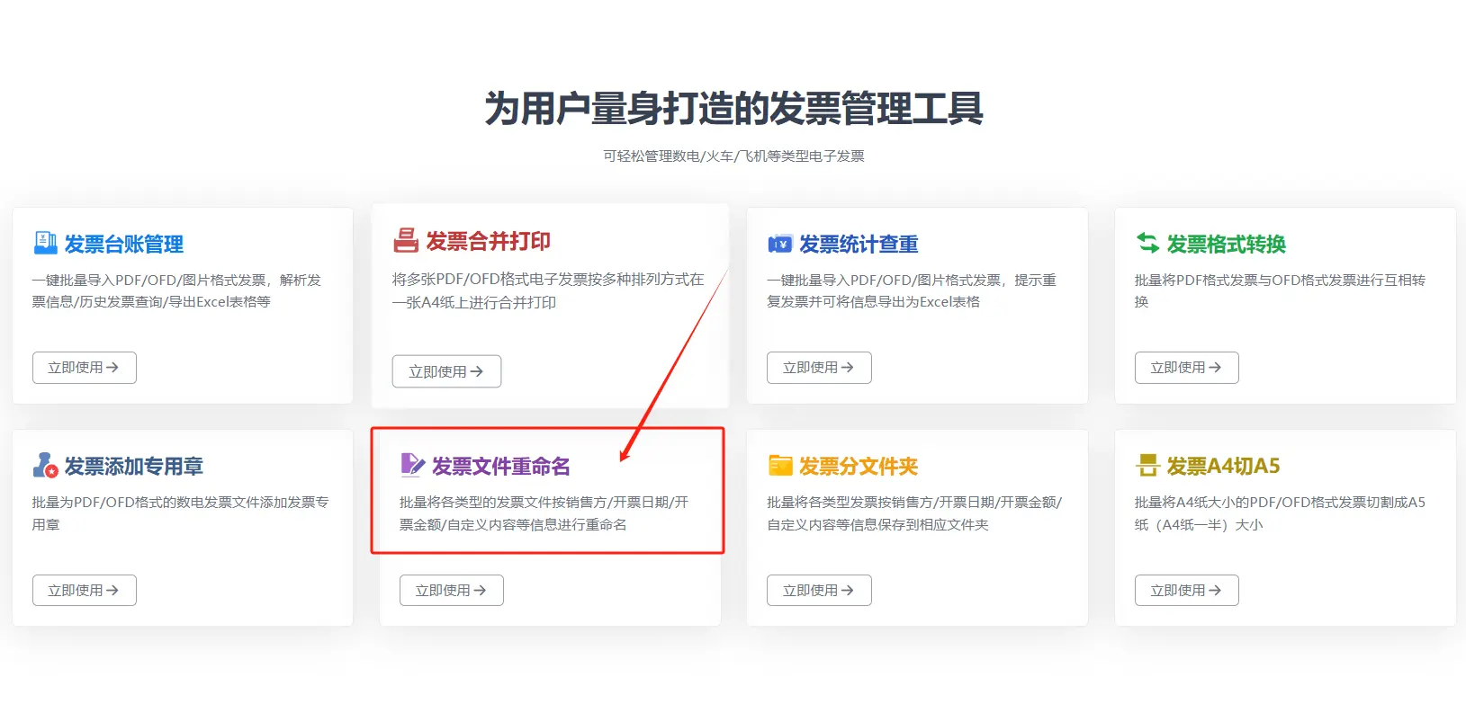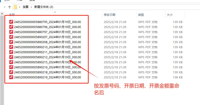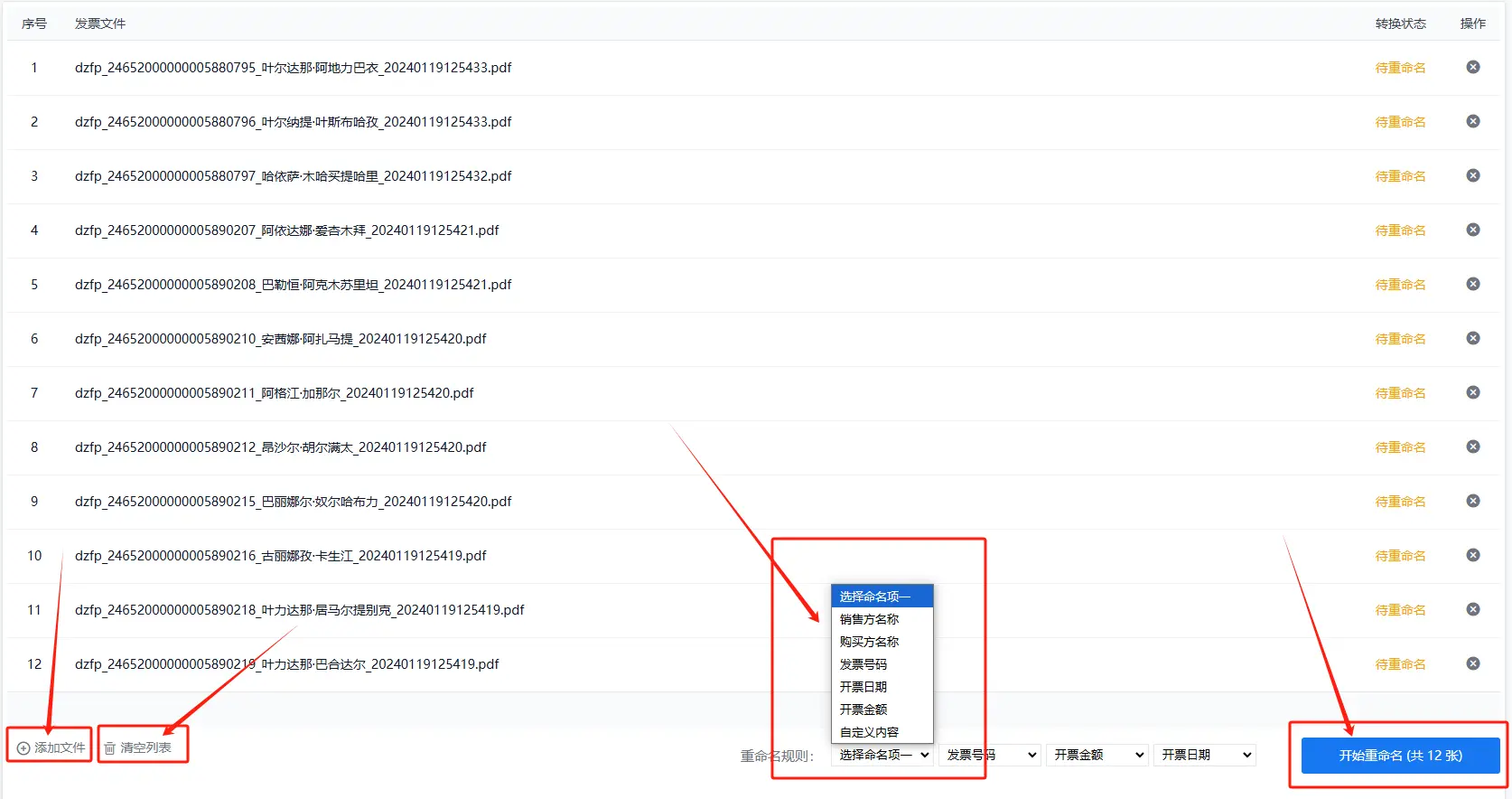 本功能可实现将PDF发票按发票的销售/购买方名称、发票号码、开票日期、开票金额以及自定义名称对PDF发票批量重命名。