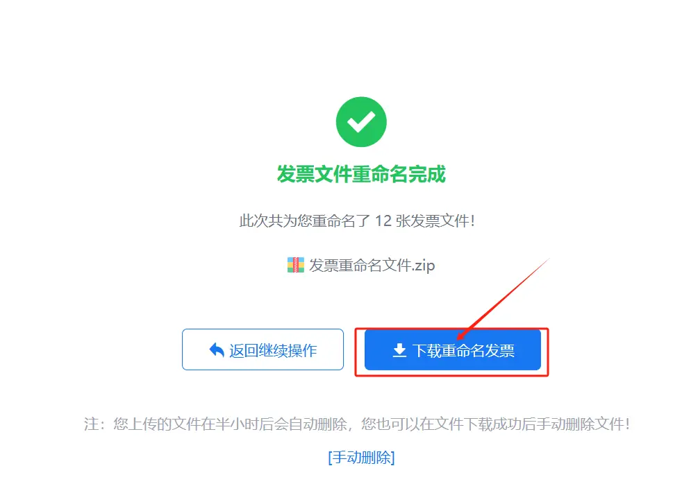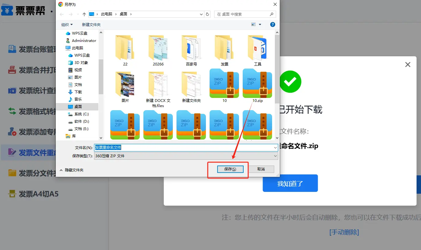 文件重命名完成后,页面会显示本次重命名的发票文件个数。点击“下载重命名发票”按钮,选择文件保存位置,点击“保存”按钮,重命名文件即可完成下载。下载文件为压缩包格式,右键鼠标解压即可。