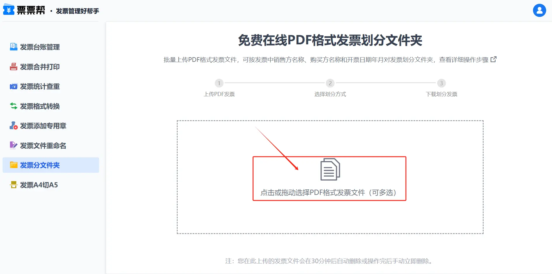 点击图示虚线框内空白处,上传需要划分文件夹的PDF发票文件。