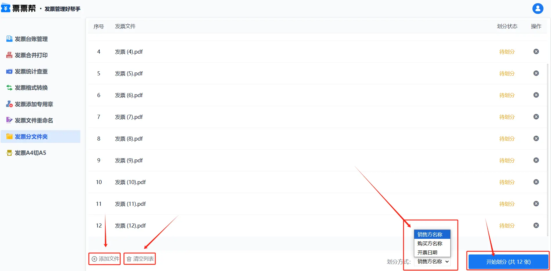 设置分文件夹方式:文件上传好后,我们在页面右下方划分方式处选择发票的划分方式,这里我们可以选择以销售方名称、购买方名称以及开票日期对发票进行划分文件夹。