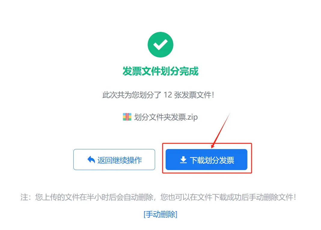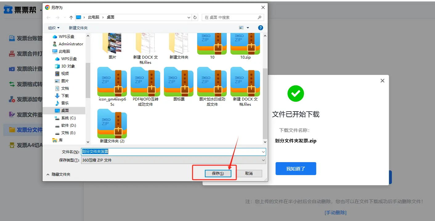 文件划分文件夹完成后,页面会显示本次划分文件夹的发票文件个数。点击“下载划分发票”按钮,选择文件保存位置,点击“保存”按钮,划分发票文件即可完成下载。下载文件为压缩包格式,右键鼠标解压即可。