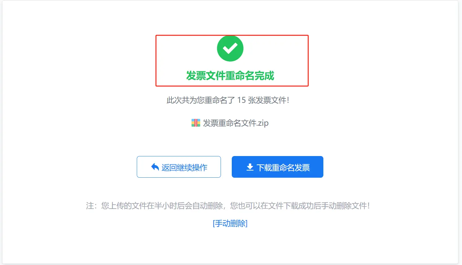 确认重命名:如果预览结果满意,点击“确认重命名”按钮,系统将自动为所有电子发票进行批量重命名。
