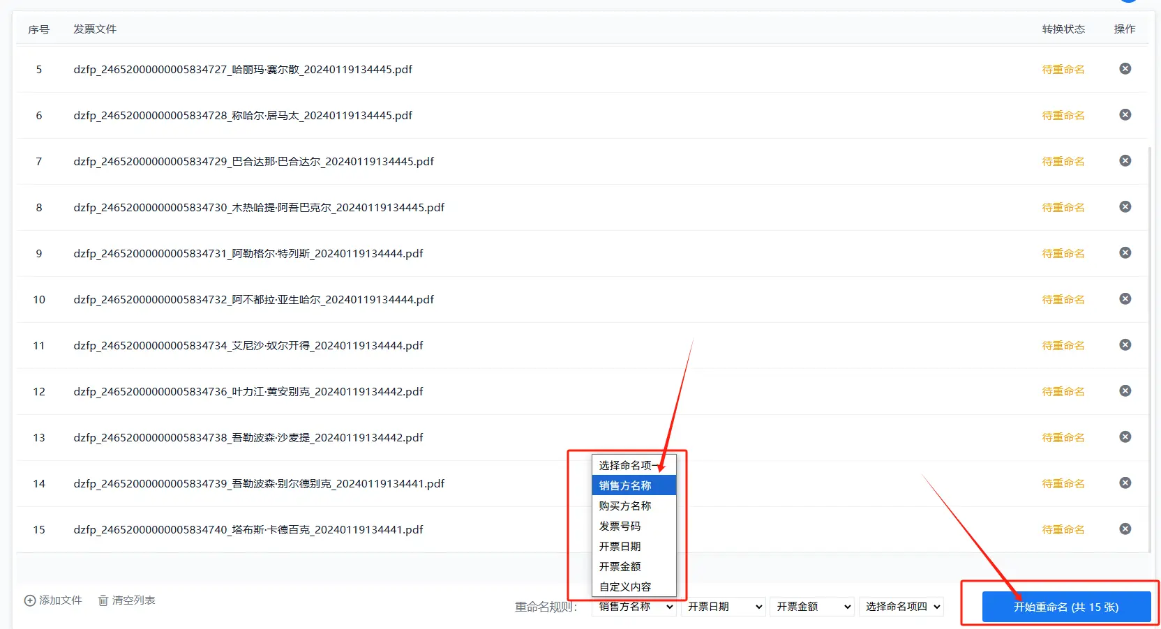 选择重命名规则:在导入完成后,系统会提供多种重命名规则供您选择。您可以选择以发票号码、开票日期和开票金额为基础的命名格式。