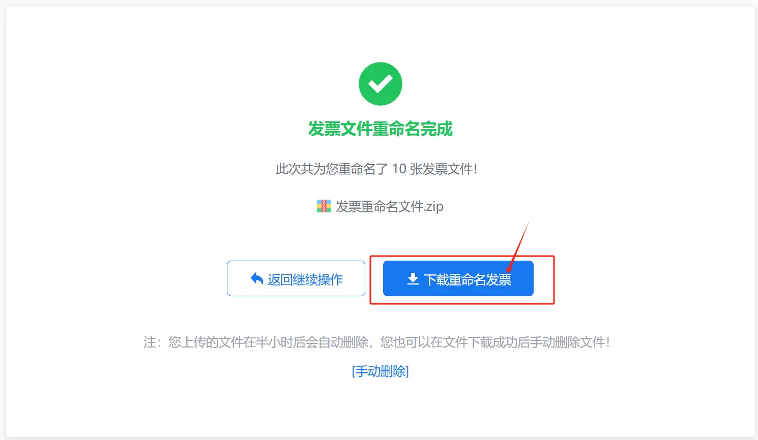 下载重命名文件:点击“下载重命名发票”按钮,下载重命名后文件。