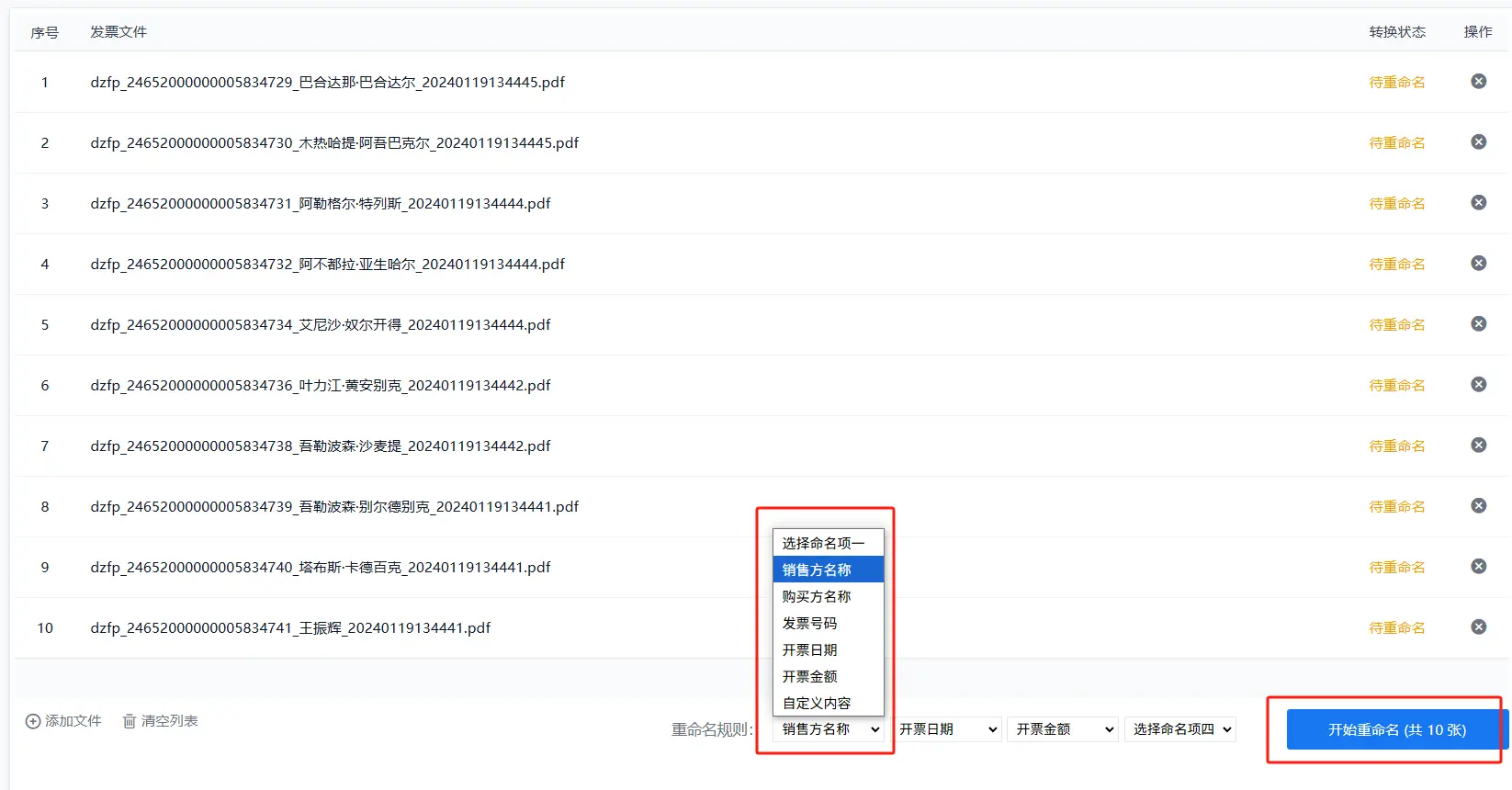 一键重命名: 确认无误后,点击“开始重命名”按钮,即可快速完成所有发票的重命名。