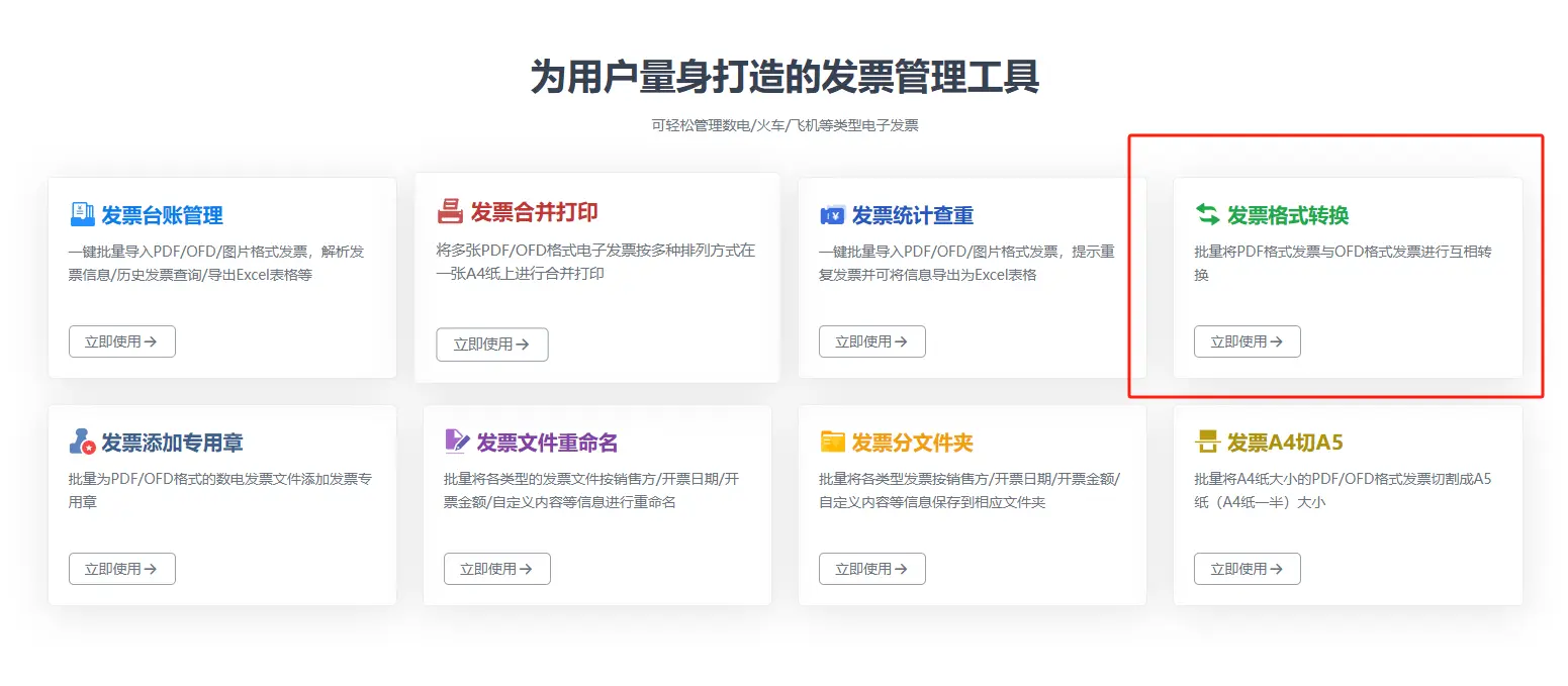 找到转换工具:在首页上,找到“发票格式转换”工具的入口,点击进入。