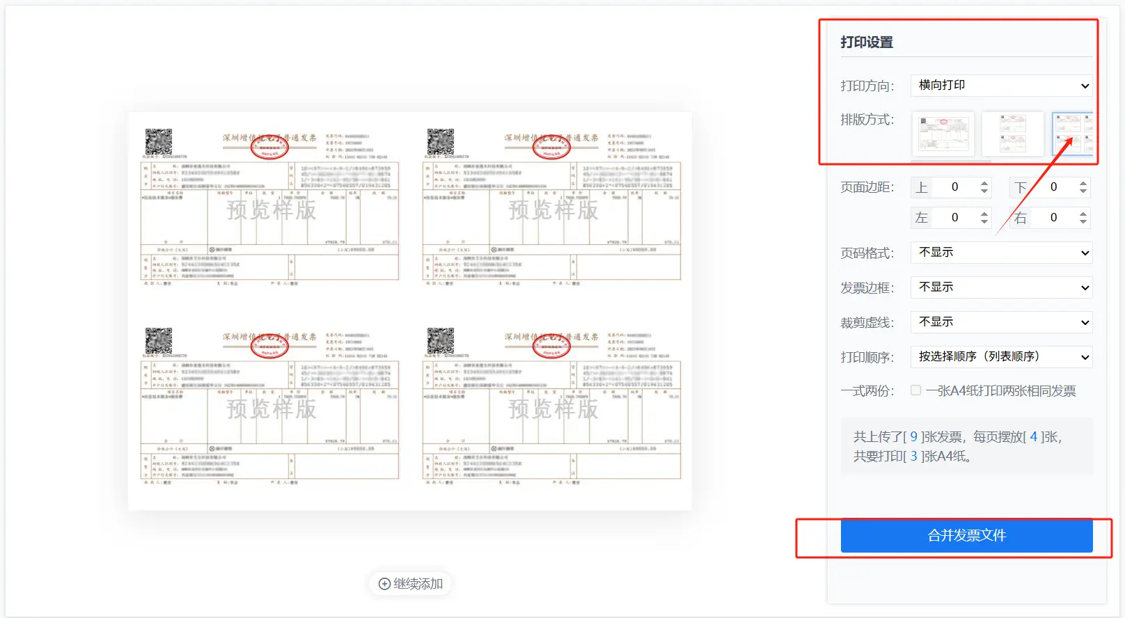 设置排版方式:上传文件后,您可以根据需要设置排版方式,包括每页打印的发票数量、发票的排列顺序等,以确保打印效果符合您的要求。