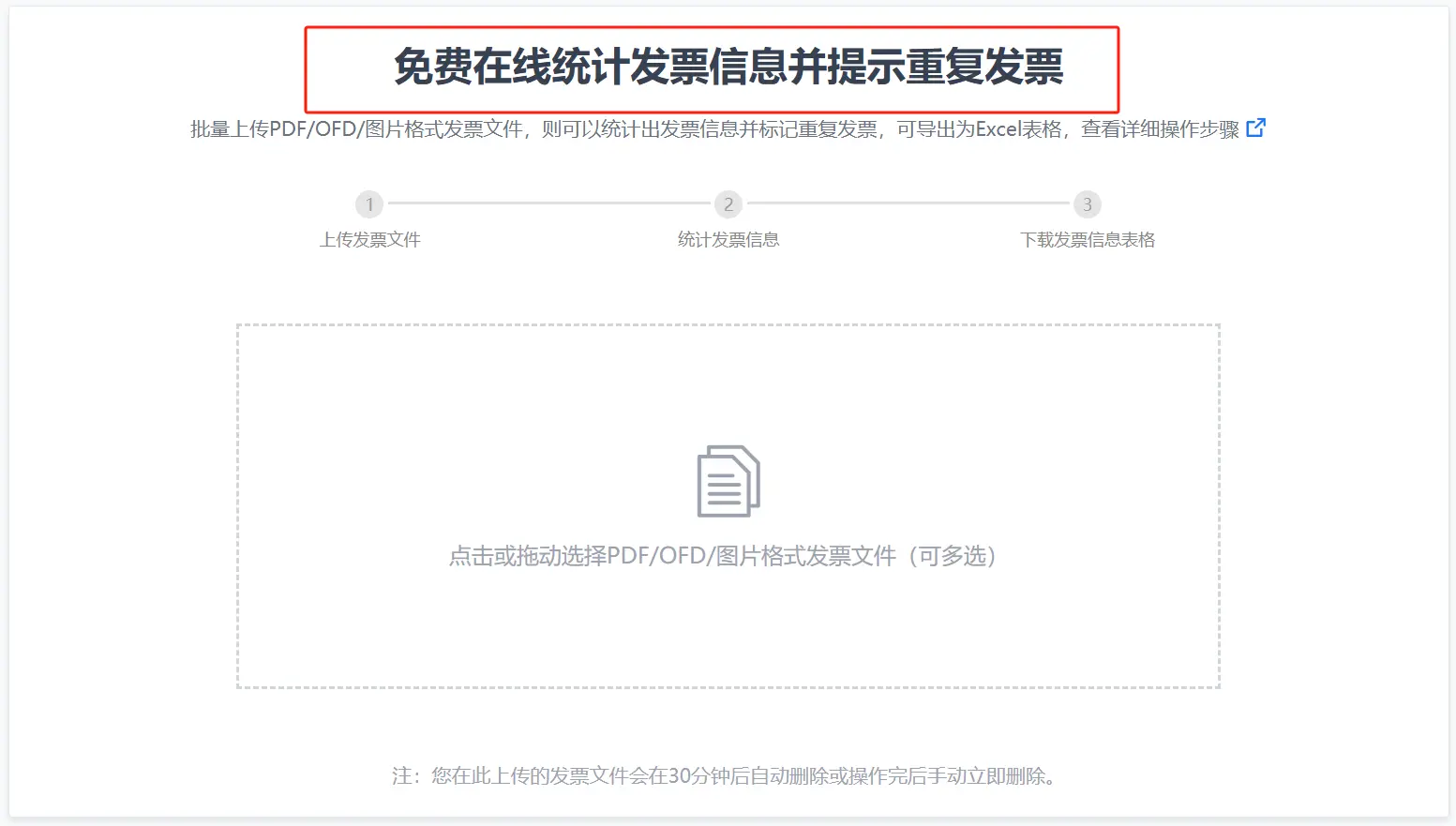 点击“上传发票文件”按钮,选择需要查重的电子发票文件。票票帮支持多种格式的电子发票文件上传,如PDF、OFD等。用户可以一次性上传多个文件,系统会自动对这些文件进行批量处理。