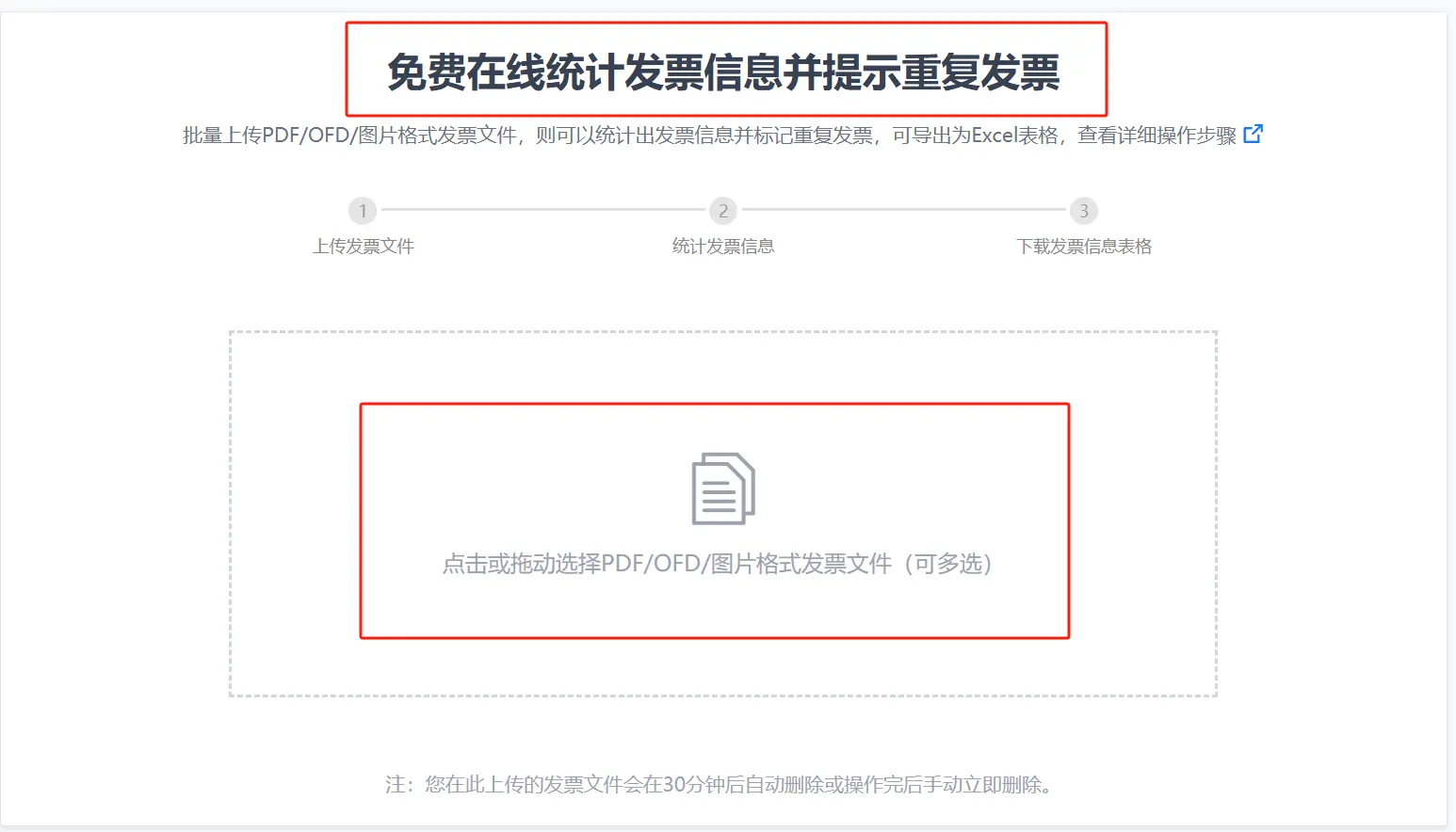 点击“上传文件”按钮,支持拖拽或手动选择本地存储的发票文件(PDF/OFD/图片等格式)。建议提前按日期或部门分类文件夹,便于后续管理。