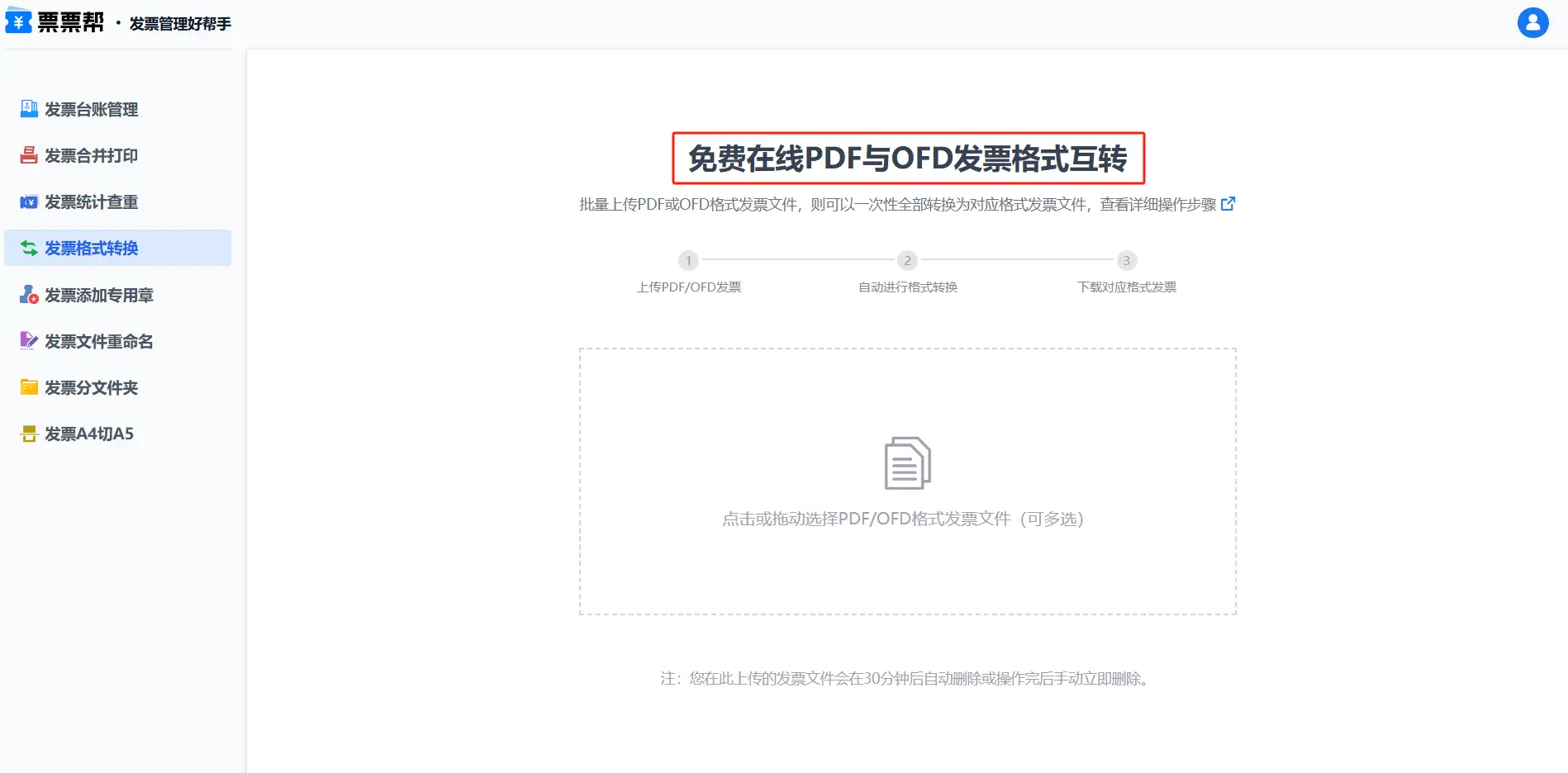 票票帮是一款功能强大的在线文件转换工具,支持多种文件格式之间的转换,包括OFD转PDF。使用票票帮进行转换非常简单,您只需按照以下步骤操作: