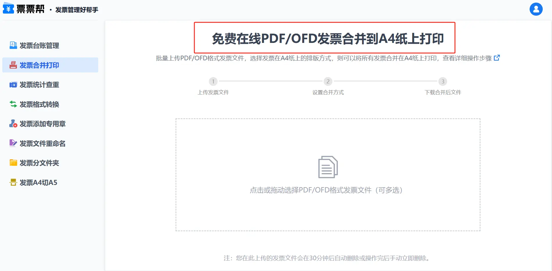 上传发票:在首页,点击“发票合并打印”功能,选择“上传文件”按钮,上传需要合并的发票文件。票票帮支持多种格式,包括PDF、JPG等。