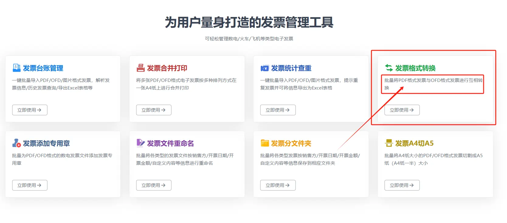 选择发票格式转换功能:在首页找到“发票格式转换”功能入口,点击进入。