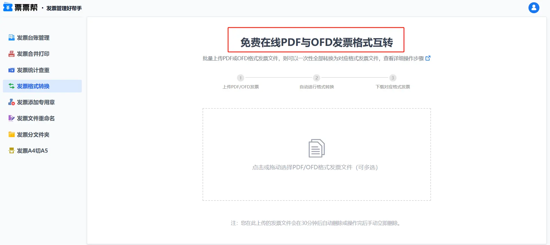 票票帮不仅提供发票管理服务,还支持OFD文件的在线转换。操作简单,步骤如下: