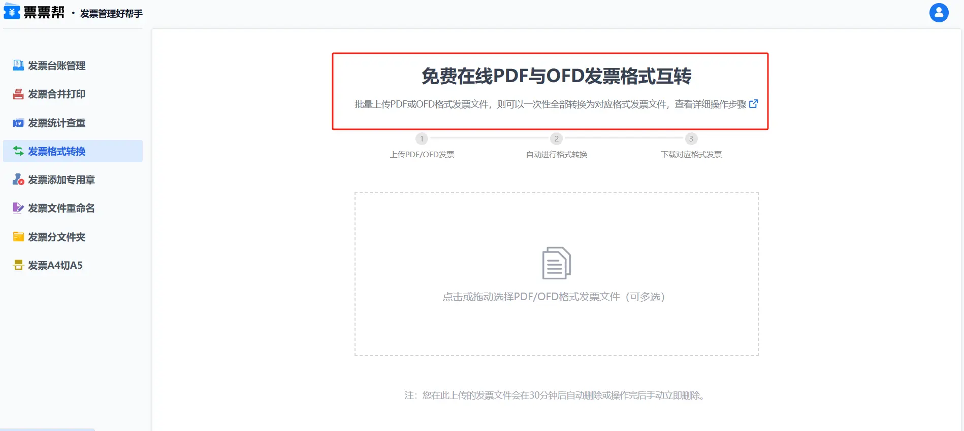 在众多的OFD转PDF工具中,票票帮凭借其专业的发票管理功能和用户友好的操作界面,成为了许多用户的首选。除了格式转换,票票帮还提供了发票的管理、查询、存档等多种功能,帮助用户高效管理发票,节省时间和精力。