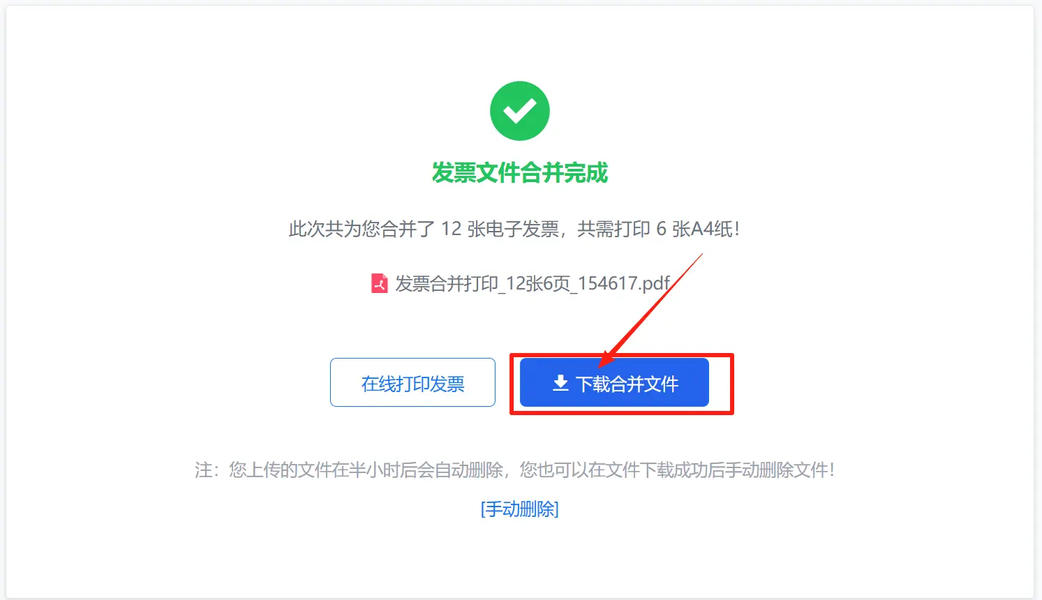 确认打印排版无误后,您可以点击“合并”按钮。票票帮将会自动处理您上传的发票文件,并将其合并为一份新的PDF文件,确保每张发票都能在一张纸上正确显示。