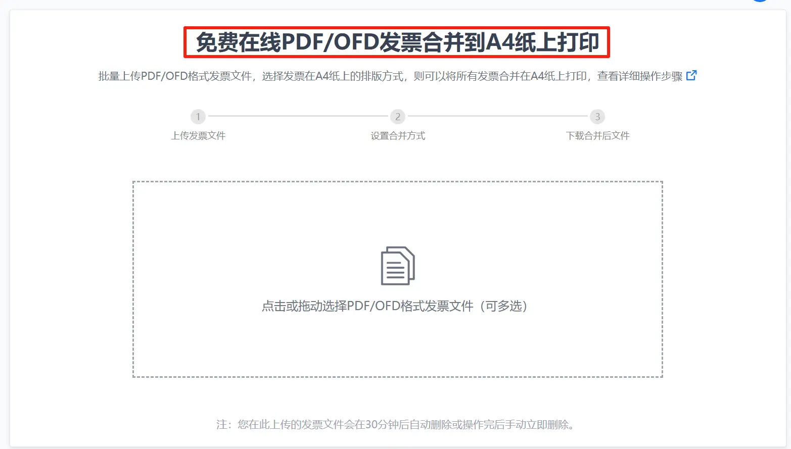在发票合并打印页面,您会看到一个“上传发票”按钮。点击该按钮,选择您需要打印的PDF发票文件。票票帮支持多种格式的发票上传,您可以一次性上传多张发票,系统会自动处理。
