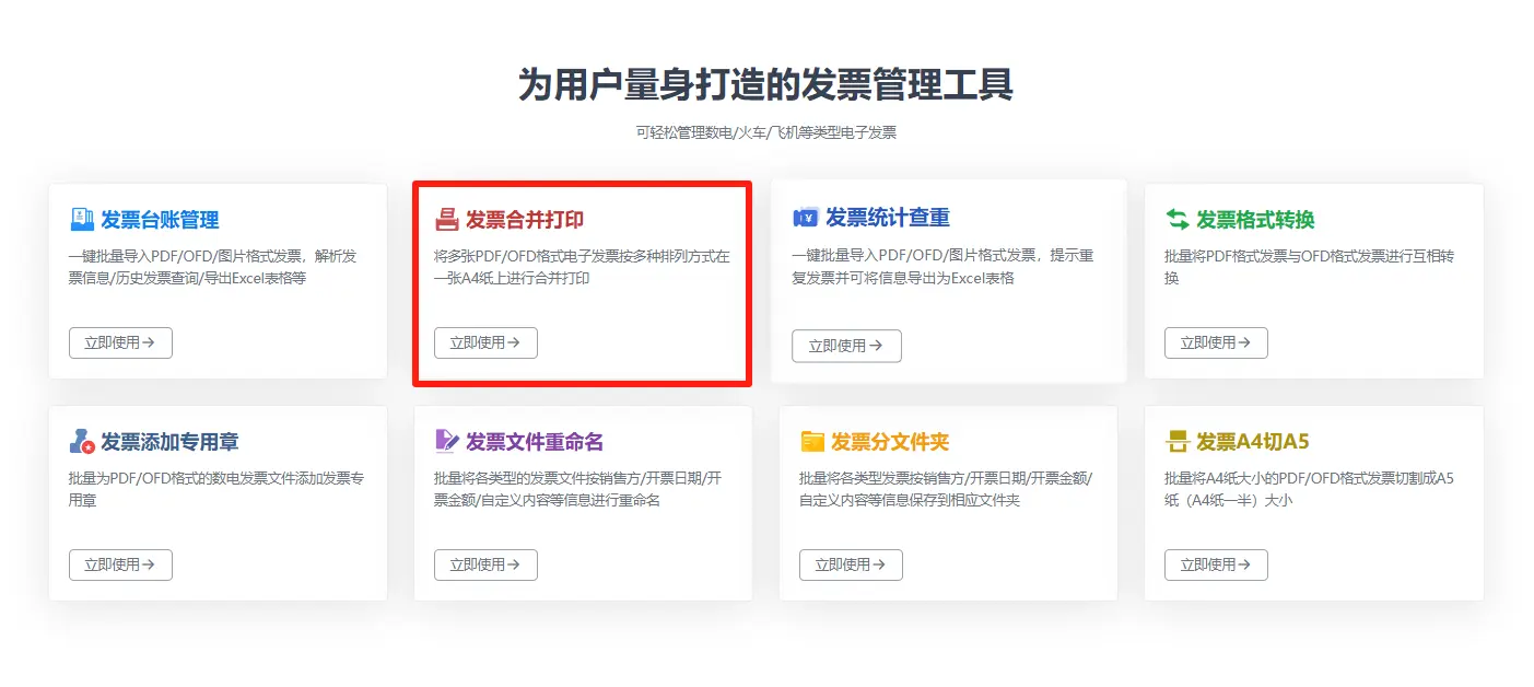 在票票帮官网首页,您可以找到“发票合并打印”功能。通常,这个功能会在主菜单或工具栏中显著位置。点击进入该功能页面,您将看到相关的操作说明和功能介绍。