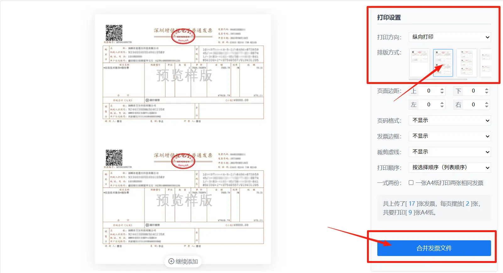 上传完发票后,您需要进行打印排版设置。在排版设置界面,您可以选择以下选项: