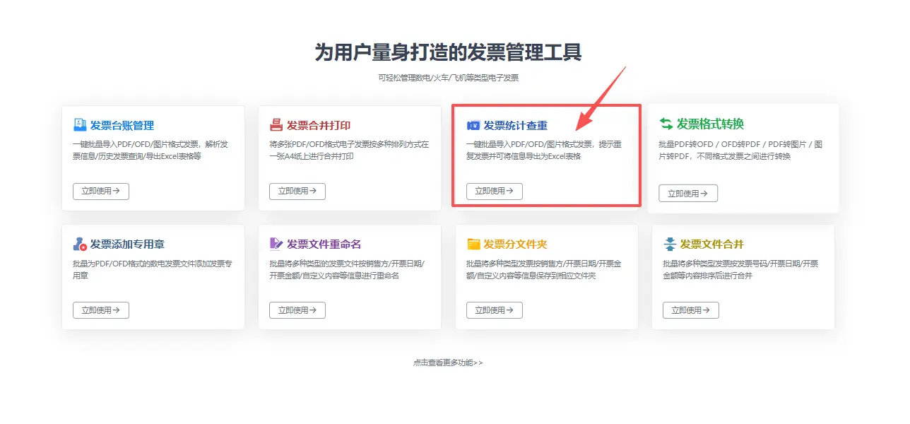 在官网首页,您会看到多个功能模块。找到“发票统计查重”功能,并点击进入。在此页面,您将看到不同的查重模式,选择“扫码枪模式”以便进行高效的批量查重。