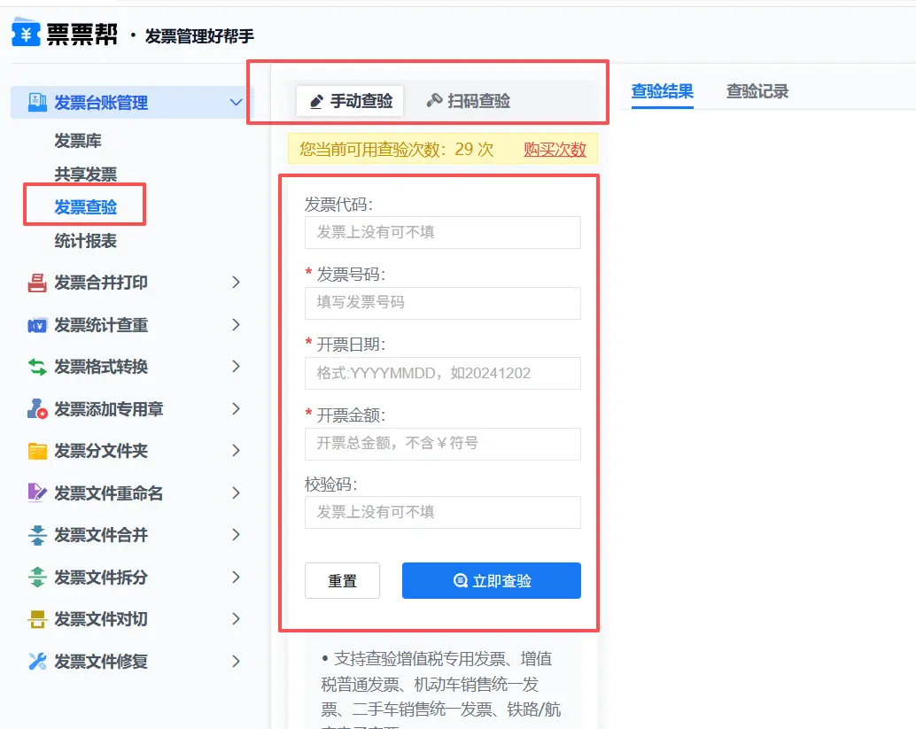 票票帮的发票查验功能是平台的核心亮点,它直接对接税务局数据库,支持手动查验、扫码查验和批量上传三种子模式。相比传统方式,票票帮无需验证码验证,响应速度更快,准确率高达99.9%。无论单张发票还是海量文件,都能轻松处理,特别适合财务团队日常使用。