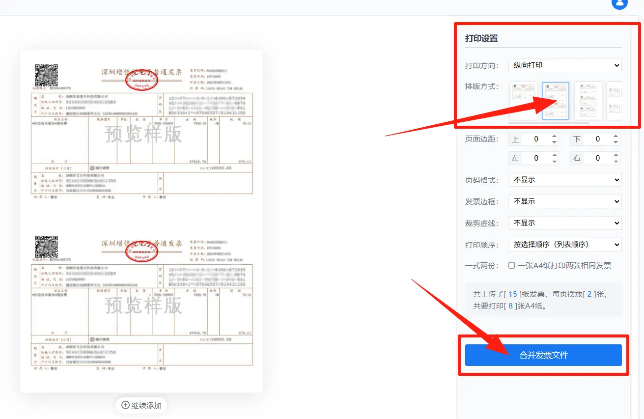 - 排版设置是确保输出清晰度与信息完整性的关键环节。根据实际需要选择排版模板:不同模板对发票的排列、留白、页眉信息等有不同表现。需要特别注意的是,一页最多允许排版9张发票,这一限制来自于常见的纸张尺寸与美观度的平衡。确认排版后,点击“合并”按钮,系统将执行文件的内部排版与合并处理。