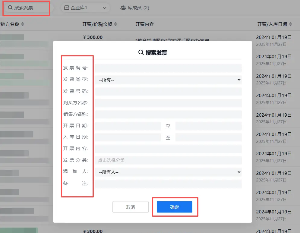 搜索发票:可通过搜索功能输入相关条件快速搜索筛选出企业库中需要的目标发票